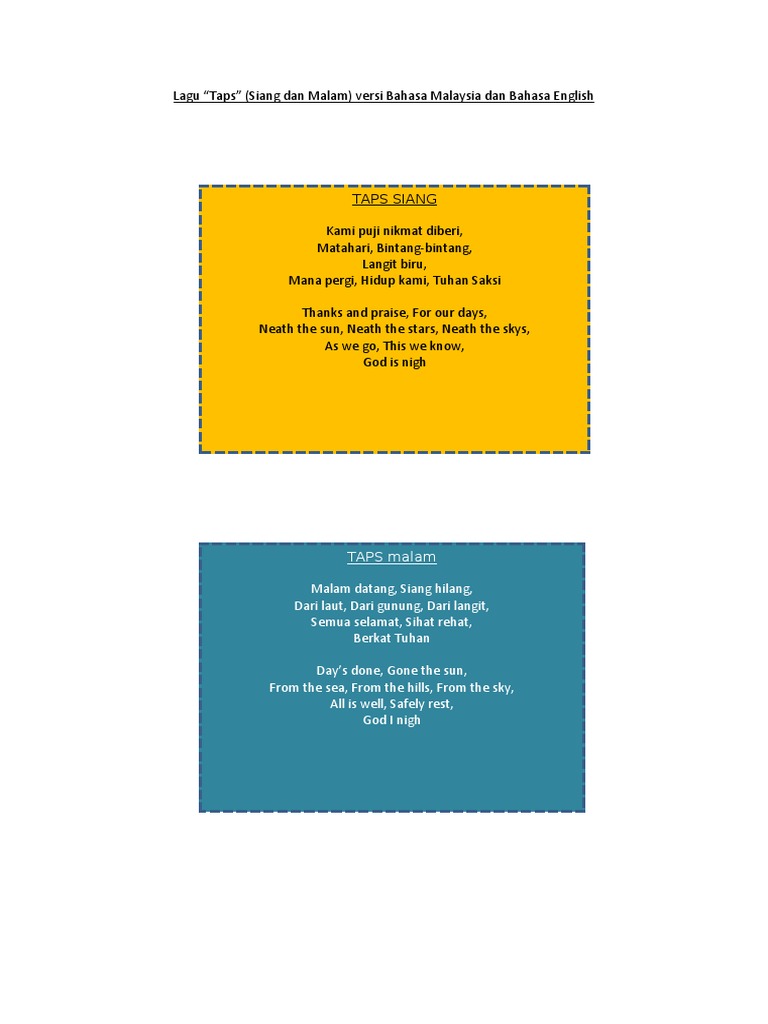 Lagu Taps Siang Dan Malam Written By Mekhisaint Friday, April 15, 2022 Add Comment Edit Taps Malam Pandu Puteri Youtube Lagu Taps Siang Untuk Ahli Persatuan Pandu Puteri Malaysia Youtube Lagu Taps Pdf Lagu Dunia Dan Taps Pdf Share this post